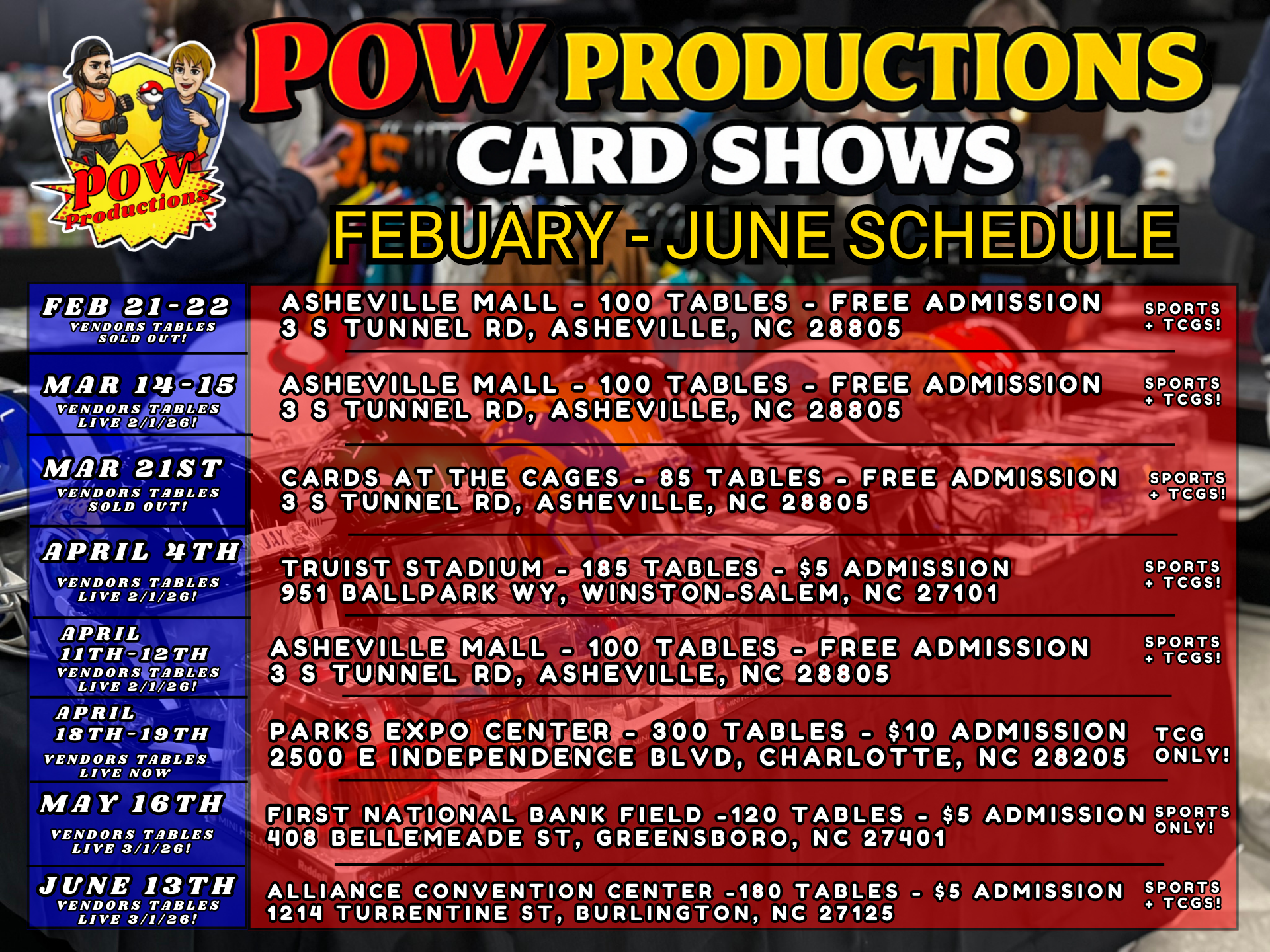 With successful shows in Greensboro, Winston-Salem, and Burlington, looking to expand into new locations, including Raleigh and Charlotte. Our mission is simple: to create events that put the community first, offering incentives to new vendors, utilizing larger venues, and staying closely connected with our followers. Whether you’re a seasoned collector or just getting started, Pow Productions is here to provide a welcoming space for everyone to enjoy the thrill of the hobby.